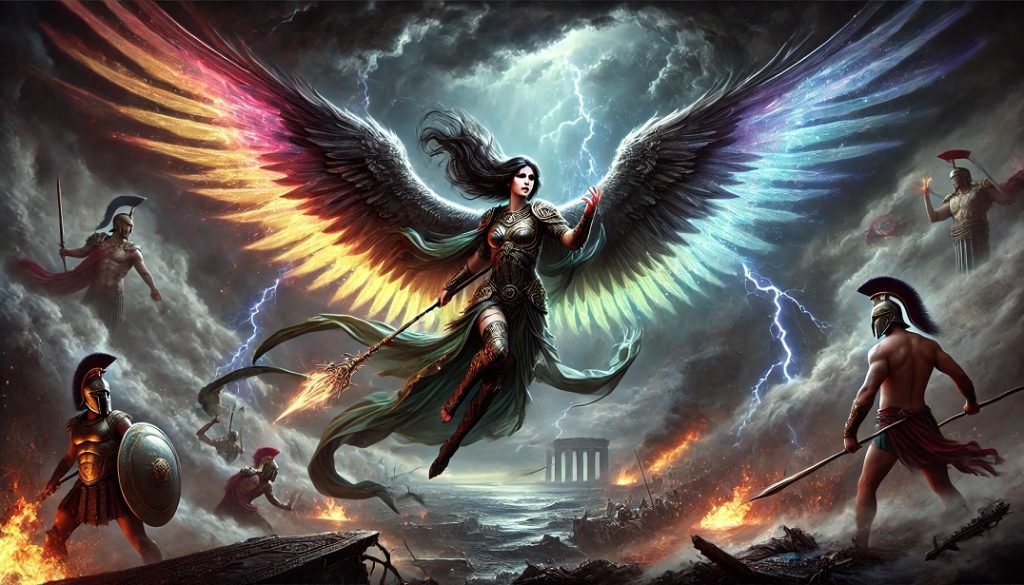 Hija de Taumante y hermana de Iris, Arce es la famosa diosa del arco iris y mensajera de los dioses. A lo largo de los relatos mitológicos, la diosa se distingue por su lealtad hacia los titanes durante la Titanomaquia, el conflicto épico entre los titanes y los dioses olímpicos. Al unirse a los titanes, se convirtió en una de sus aliadas, lo que provocó la ira de Zeus. Como castigo, el dios supremo la condenó a sufrir una eterna prisión en el Tártaro, el abismo subterráneo donde los titanes derrotados fueron encarcelados.