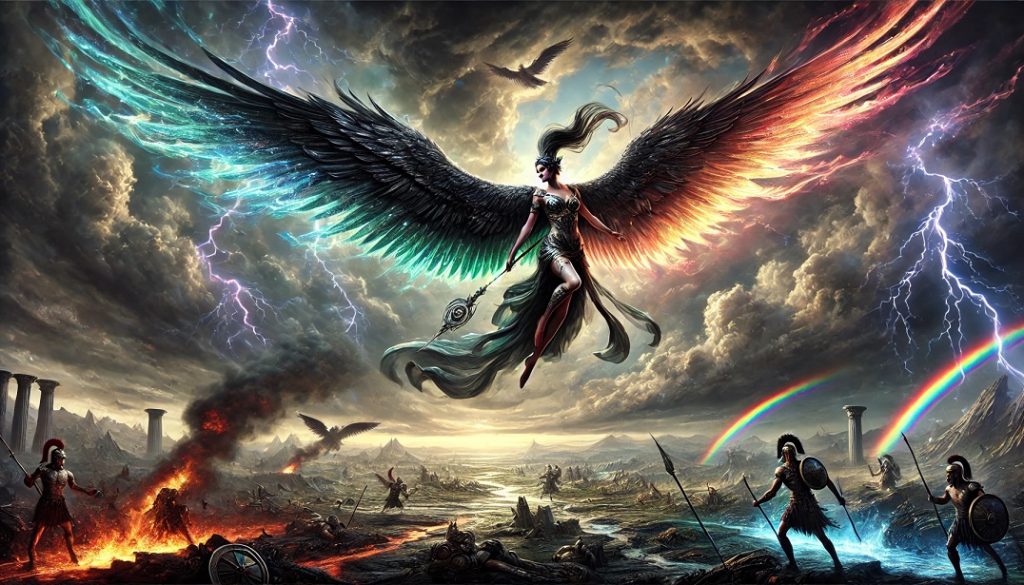 La similitud en sus roles como mensajeras, sin embargo, no se limita a sus funciones. Iris, como mensajera de los dioses, está asociada al arcoíris, un símbolo de conexión entre los cielos y la tierra. Arce, por su parte, podría estar vinculada al segundo arcoíris, más tenue y pálido, que aparece como un reflejo del primero. Esta asociación sugiere que Arce representaba una versión sombría de los colores brillantes de Iris, simbolizando quizás la duplicidad o sombra de lo divino.