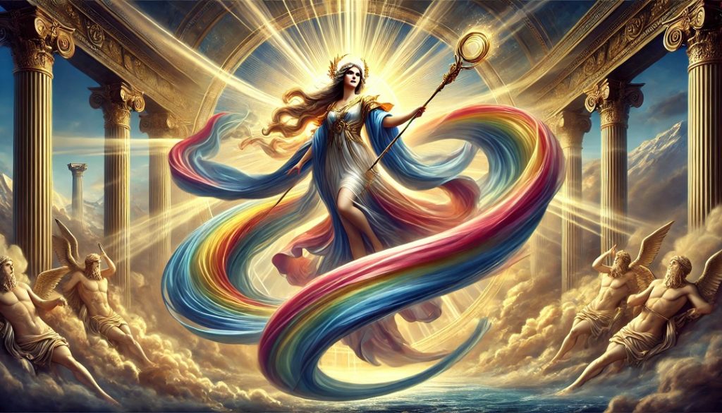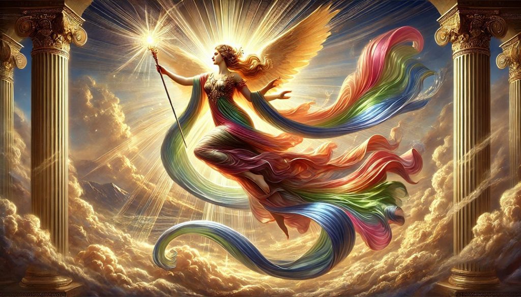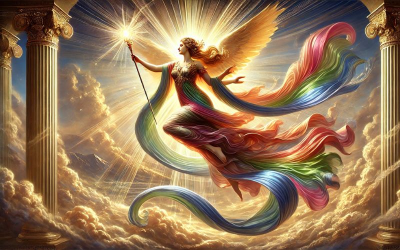 A menudo asociada con el arcoíris, su nombre en griego, «ἶρις», que significa precisamente «arcoíris», Iris refleja su función como la conexión entre los cielos y la tierra, un puente visual que aparece al final de las tormentas, cuando la luz se filtra a través de las nubes. Se presenta como una figura ágil y rápida, capaz de recorrer los cielos y la tierra, llevando los mensajes divinos a los mortales y a los propios dioses. Iris, en su rol como mensajera, la diosa se representa en la literatura clásica con «pies ligeros», reflejando su rapidez y su capacidad de atravesar diferentes mundos con facilidad.